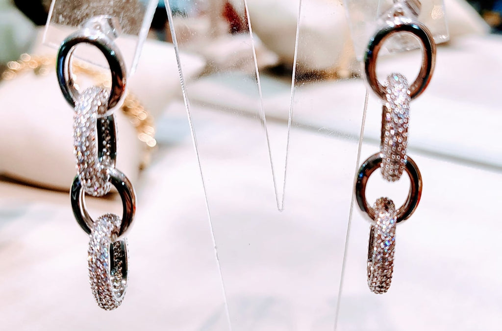 Brinco em latão de alta fusão cravejado manualmente com micro zircônia 5A Premium, nas opções de banho Ouro 18k, Ródio branco ou Bruto.
