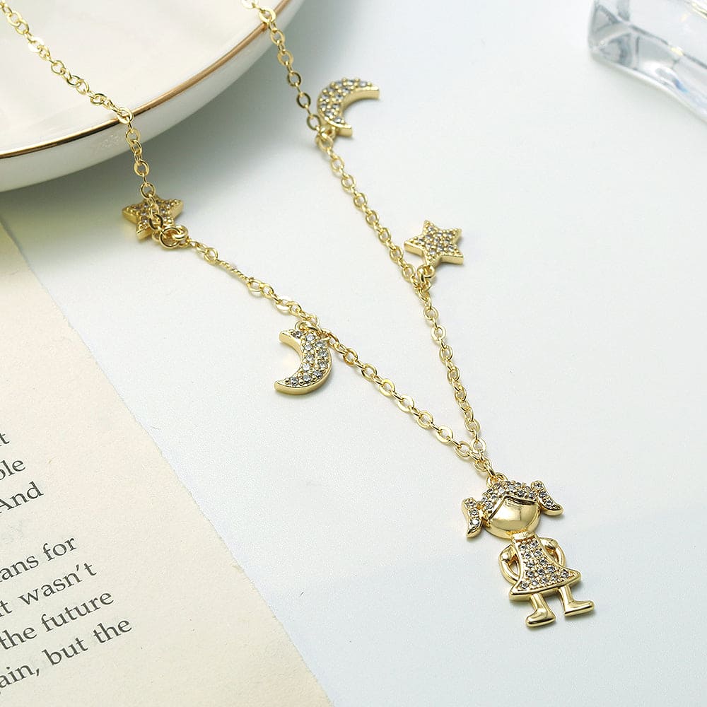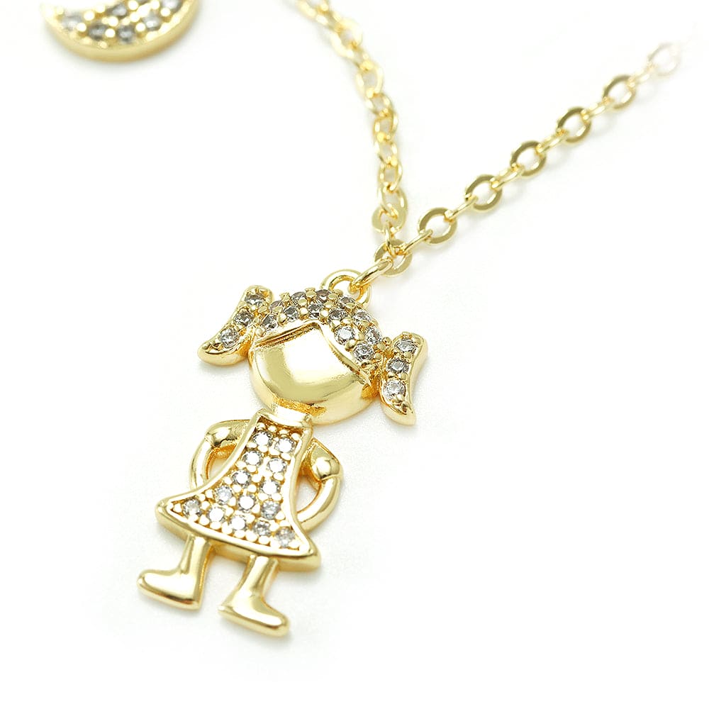Um colar cheio de significado, feito para eternizar momentos e sentimentos. O Colar Menina Estrela Lua traz uma composição delicada e encantadora: uma menina sonhadora acompanhada de uma estrela e uma lua, símbolos de ternura, proteção e sonhos sem limites.