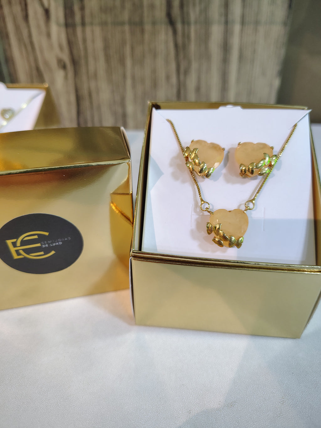 Delicadeza e sofisticação se encontram neste conjunto encantador. O design combina a suavidade dos corações com a leveza das borboletas douradas, criando uma semijoia única e repleta de significado.